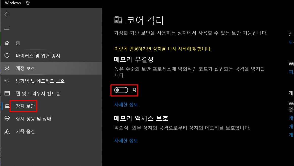 7. Windows 설정 - 업데이트 및 보안 - Windows 보안 - 장치보안 - 메모리 무결성 끔