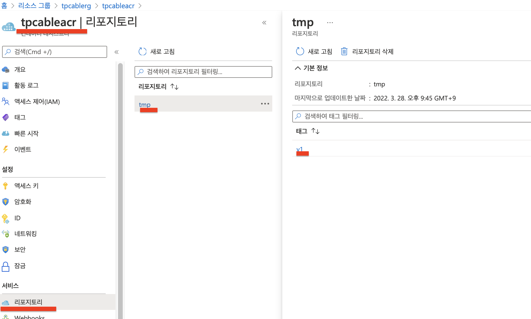 ➜ ~ az acr create -g tpcablerg -l koreacentral -n tpcableacr --sku basic