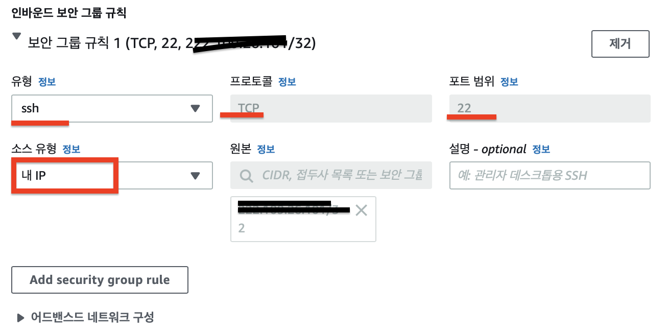 - 보안그룹을 설정한다. 특정 IP에서 특정 Port만 접근 가능하도록