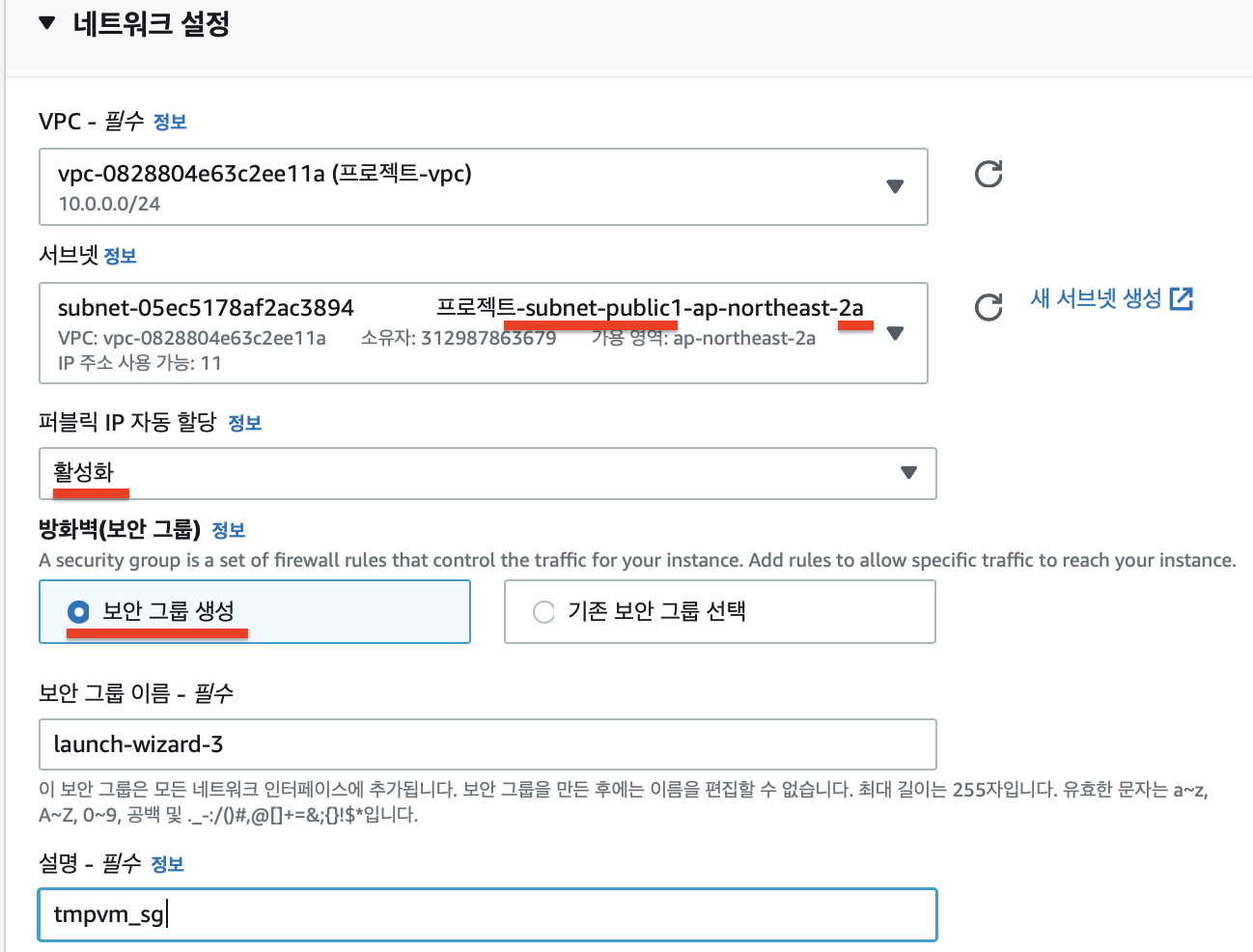 - 내가 접속 할 퍼블릭 IP를 자동으로 할당해준다.(유연한 IP도 있는데 이것을 할당하면 VM을 껏다 켜도 IP가 변동되지 않는다.)