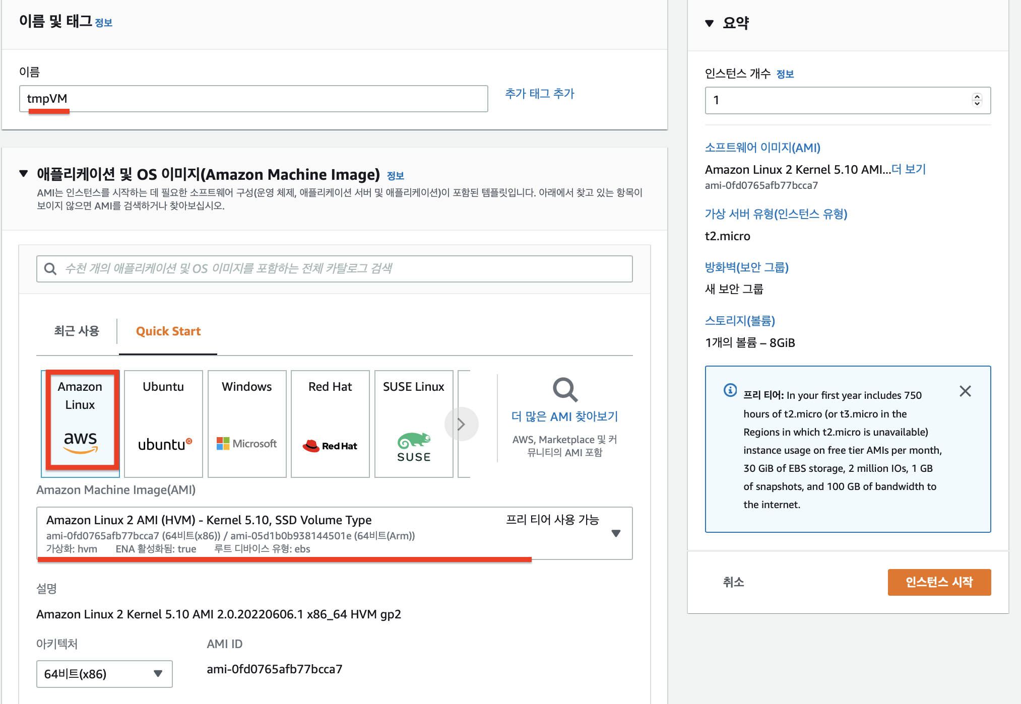 이미지는 Amazon Linux 선택(가상화는 HVM_전가상화 /PV_반가상화가 있음)