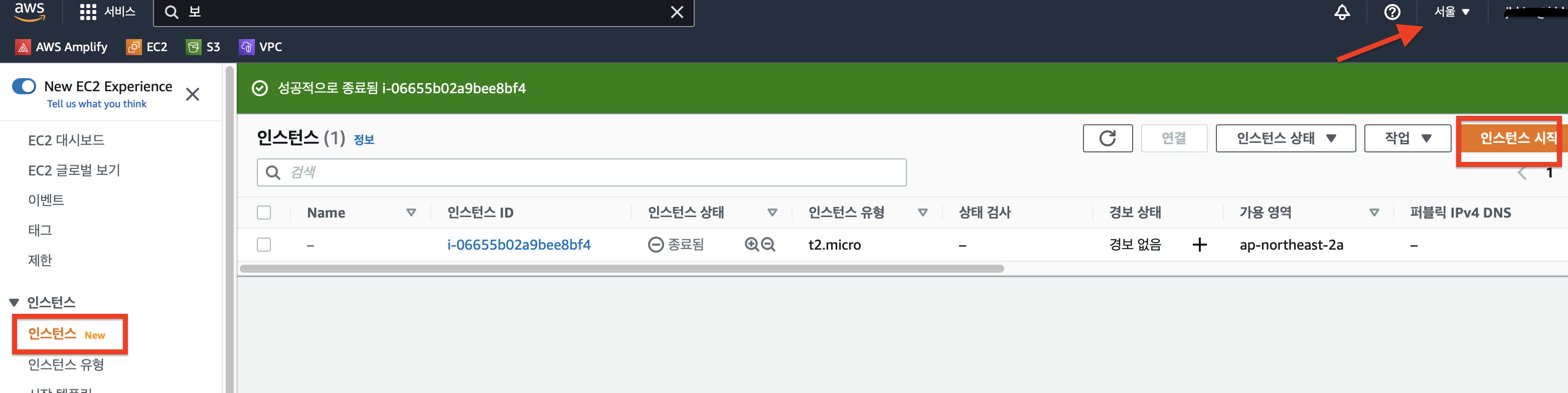 2. 리전을 서울로 변경 - 좌측에 인스턴스 선택 - 인스턴스 시작(여기서 인스턴스 시작은 VM을 시작하는게 아니라 생성 하는 것)