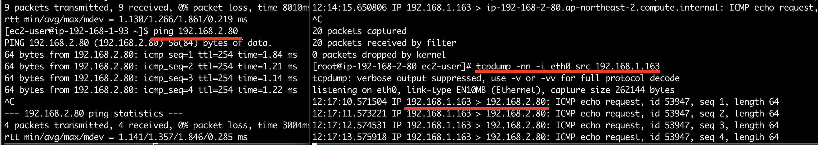 192.168.1.4 EC2에서 192.168.1.163 NAT GW를 통해 192.168.2.80 접근
