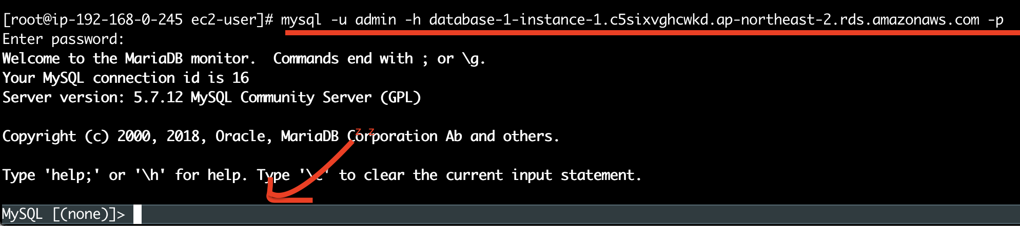 mysql -u 계정 -h endpoint -p