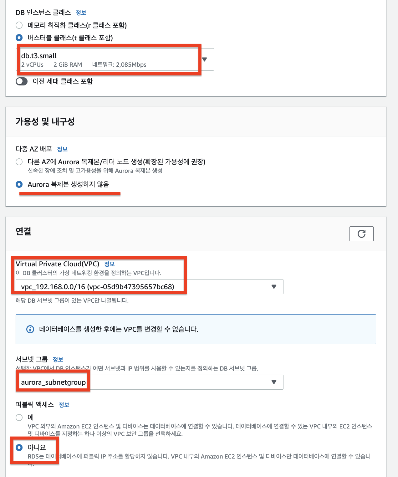 2. 비용 절감을 위해 스펙이 낮은 VM선택, 복제본 생성하지 않음, VPC 선택, 앞에서 생성한 Subnet Group 선택, Public Access 아니요