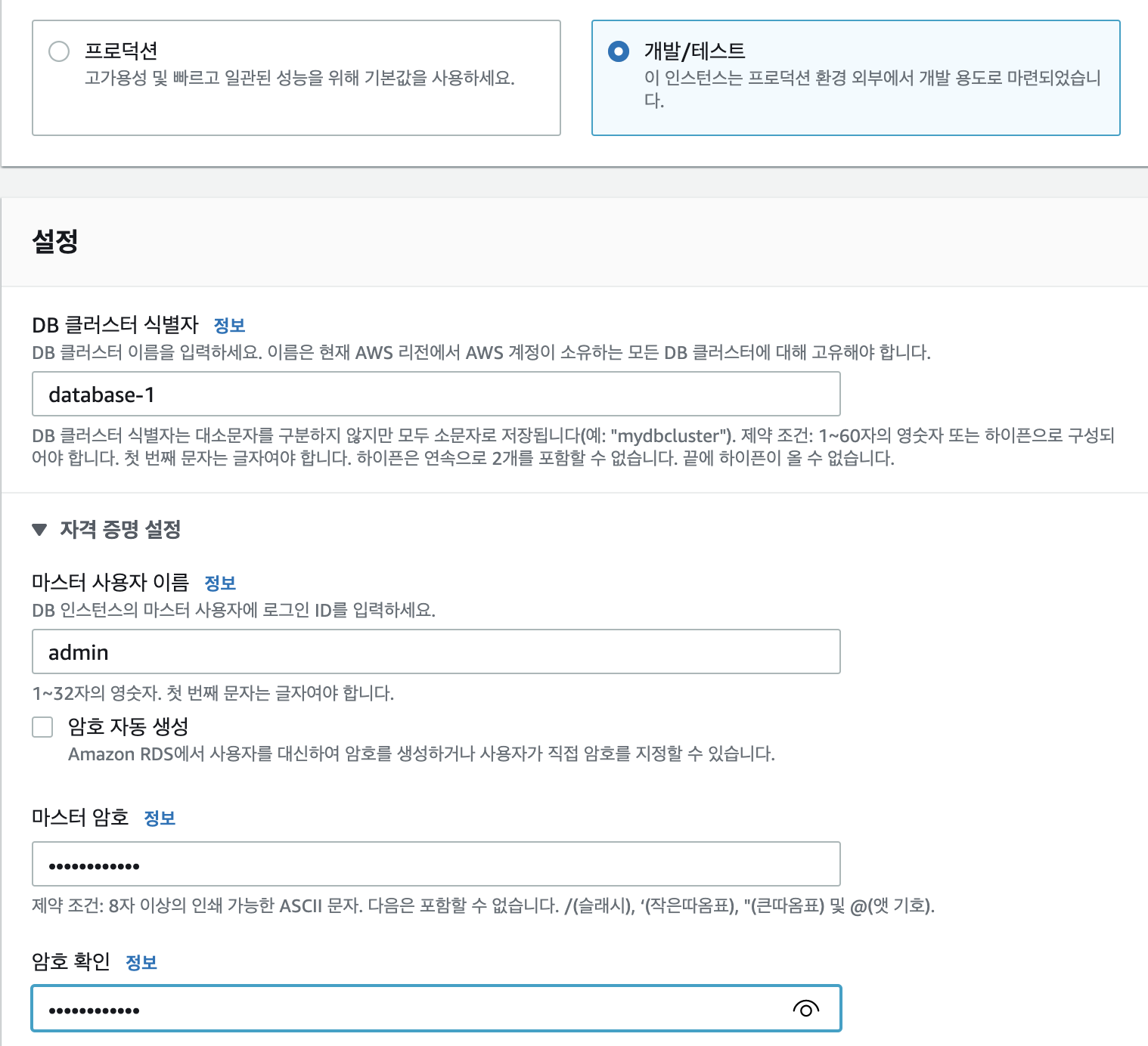 1. 시간이 걸리니 Aurora DB 먼저 생성 (기본값)