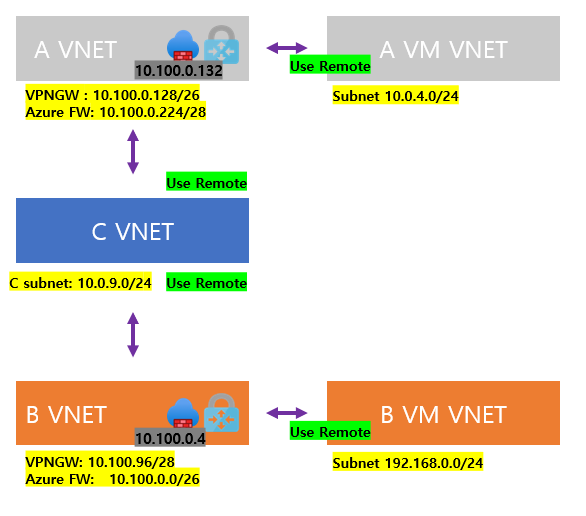 일반적인 설정으로는 C VNET에서 A, B VNET은 통신 가능하나, A VM VNET B VM VNET까지는 라우팅 테이블이 없기 때문에 통신이 불가능하다. Azure FW를 사용한 경험이 있으면 A VM VNET, B VM VNET의 경우 Prefix를 0.0.0.0/0, 가상어플라이언스, Azure FW 사설 IP 지정 서브넷은 각각의 VNET + 방화벽 설정(A vm ip, C vm ip / A vm ip, B vm ip)를 통해 설정을 통해 A -> C 또는 B -> C로 통신이 된다는 것을 알것이다. 문제는 앞에서 언급 한 것처럼 C VNET은 A VM VNET, B VM VNET에 대한 경로 테이블이 없기 때문에 별도로 설정이 필요하다. 그럴경우 C subnet에 대해 아래와 같이 UDR ..