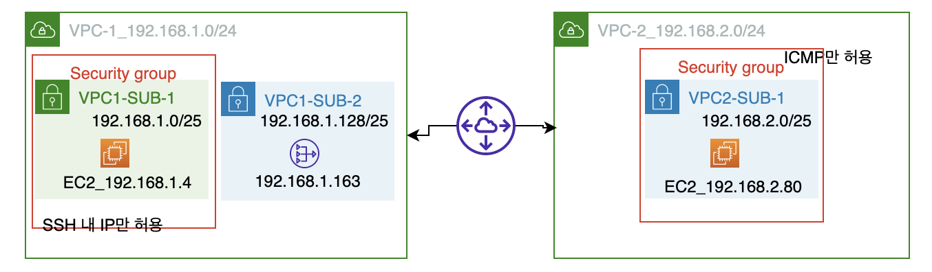 192.168.1.4 EC2에서 192.168.1.163 NAT GW를 통해 192.168.2.80 접근 [구성] VPC 1, VPC2 생성 VPC는 피어링 VPC1 -subnet1 192.168.1.0/25 (EC2 1대) -subnet2 192.168.1.128/25 NAT Gateway(Private) VPC2 -subnet1 192.168.2.0/25 EC2 1대 경로테이블 VPC1 -subnet1 목적지 EC2 통신을 위해서는 NAT Gateway 로 라우팅 인터넷 게이트웨이는 SSH 접속을 위해 생성 VPC1 -subnet2 VPC2 subnet1에 대한 피어링 라우팅만 설정 VPC2 -subnet1 VPC1 subnet2에 대한 피어링 라우팅만 설정 (접속 편의를 위해서 인터넷 게이트웨이도 ..