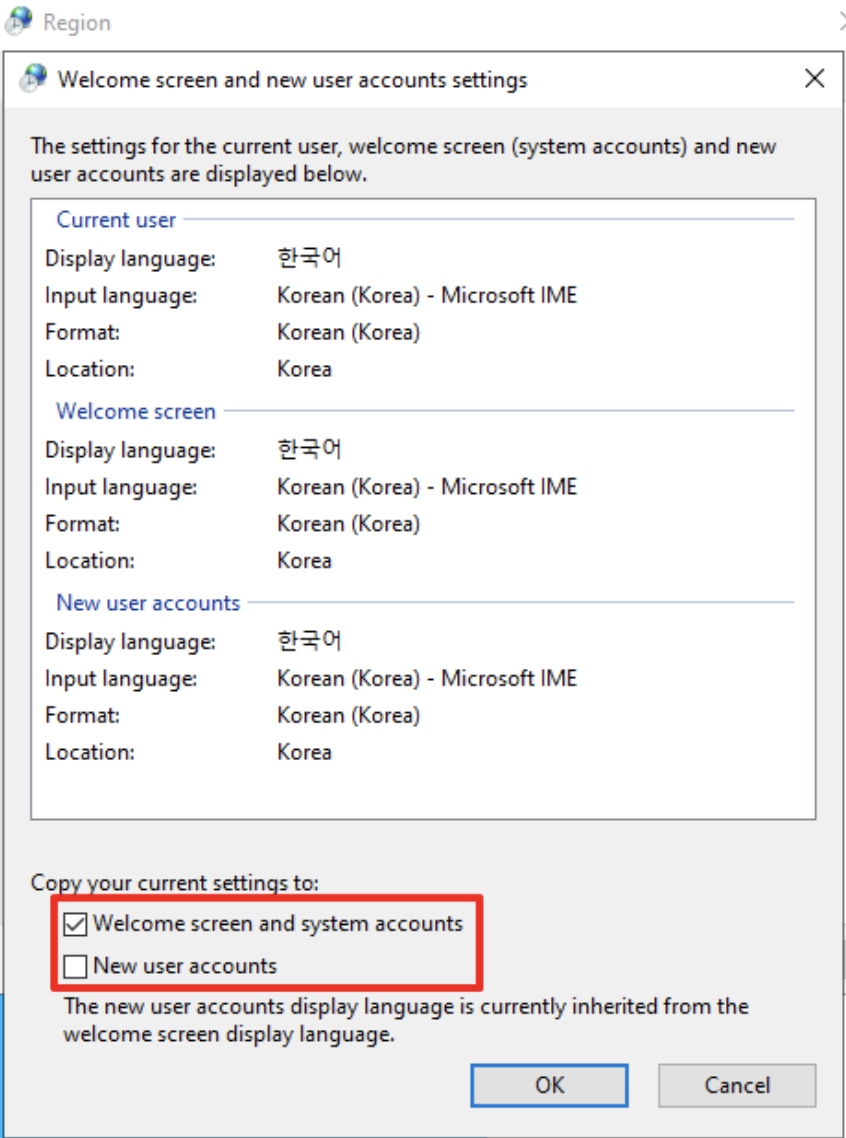 [Windows] Sysprep 이후 한글 표시 안될 때 sysprep 실행 후 이미지로 VM 생성 시 영어로 보일때가 있다. 아래와 같이 추가 설정이 필요하다. 1. Region - Administrative- Copy setting... 2개항목 선택 후 ok 재시작 보류 2. change system locale 선택 korean(korea)선택 후 재부팅 OS/Windows 2021.08.10
